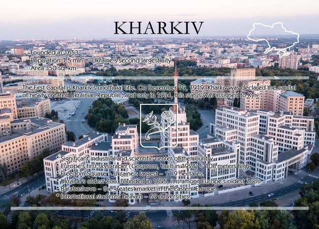 Поштова картка з Харківом - першою столицею радянської України. Це місто було першим і нині залишається потужним промисловим і освітнім регіоном України.